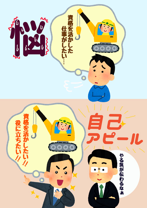 企業ブースを訪問し、自身の特殊な経歴や、クレーン・玉掛けの資格はあるけれど、実務経験が無いことを伝えると、それでも応募を受け付ける、と言ってもらえたので、すぐに『求職者カフェ』で応募書類を作成し、応募しました。